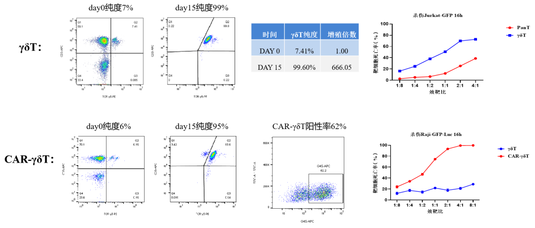 γδT:培养15天,γδT的纯度能达到99.6%,增殖666.05倍,并且与未激活处理的PanT相比,杀伤更强。