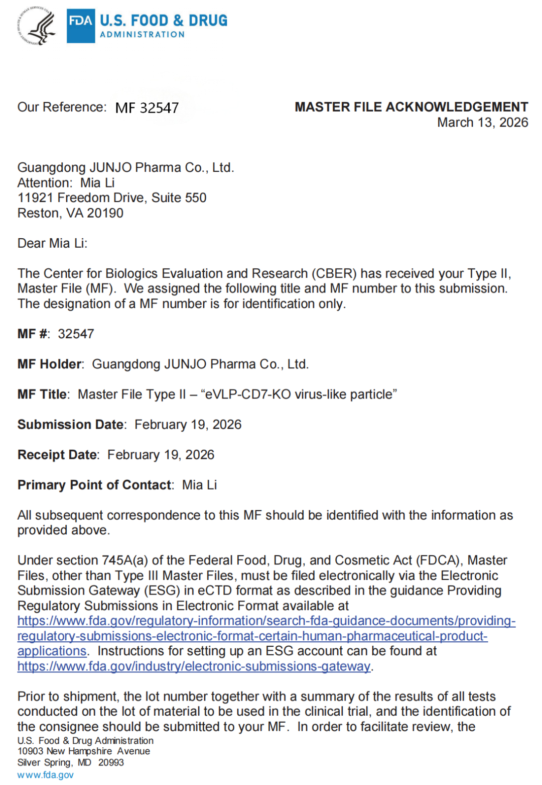 近期,J9国际站 J9集团在细胞与基因治疗核心技术国际化方面取得重要里程碑进展。集团全资子公司广东君厚生物医药有限公司自主研发的 “eVLP-CD7-KO virus-like particle(CD7基因敲除工程化类病毒颗粒)” 已正式完成美国食品药品监督管理局(FDA)Drug Master File(DMF)备案,备案号 MF 32547,并取得美国 FDA 生物制品评估与研究中心(CBER)受理确认。