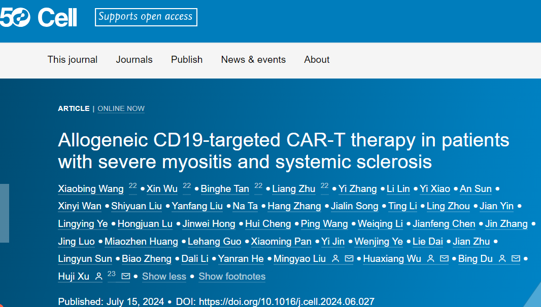 2024年7月15日,发表在Cell杂志上,题为“Allogeneic CD19-targeted CAR-T therapy in patients with severe myositis and systemic sclerosis”的文章,公开了异体通用型CAR-T疗法(TyU19)治疗自身免疫疾病研究成果,TyU19的推出是自身免疫疾病治疗领域的一个重要里程碑,这也是Cell首次发表CAR-T治疗自免疾病的研究成果,它的成功应用为许多难治性自身免疫病给予新的治疗策略。现在,深圳J9国际站 J9布局的新型基因编辑递送系统已取得突破,确保细胞治疗产品的安全性和有效性,有助于细胞与基因治疗行业的整体开展。