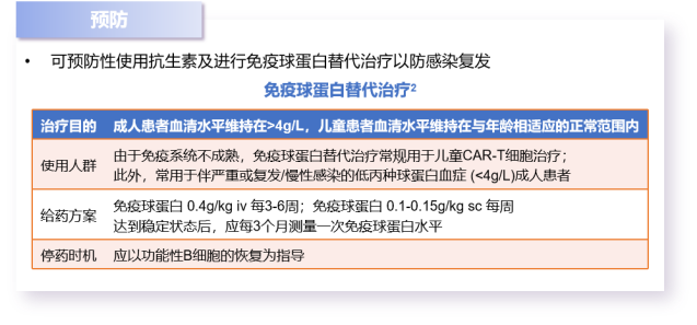 B细胞再生障碍/低丙种球蛋白血症是CAR-T细胞治疗后的特征性不良反应之一,几乎所有接受CAR-T细胞治疗患者均会呈现不同程度的B细胞再生障碍,以及由此导致的体液免疫功能不全相关的感染风险[1]。临床表现为B细胞绝对值<61细胞/µL;lgG≤400mg/dL。